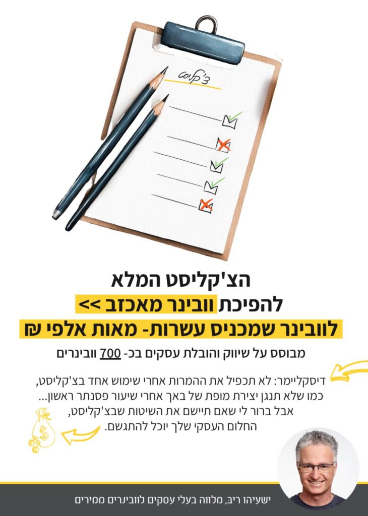 עשית כבר כמה וובינרים, השקעת, שיפרת – והמכירות נתקעו?יש סיכוי מעולה שפיספסת 2–3 דברים קריטיים…הצ’קליסט הזה נבנה בדיוק בשבילך-(מבוסס על שיווק והובלת עסקים בכ- 700 וובינרים)